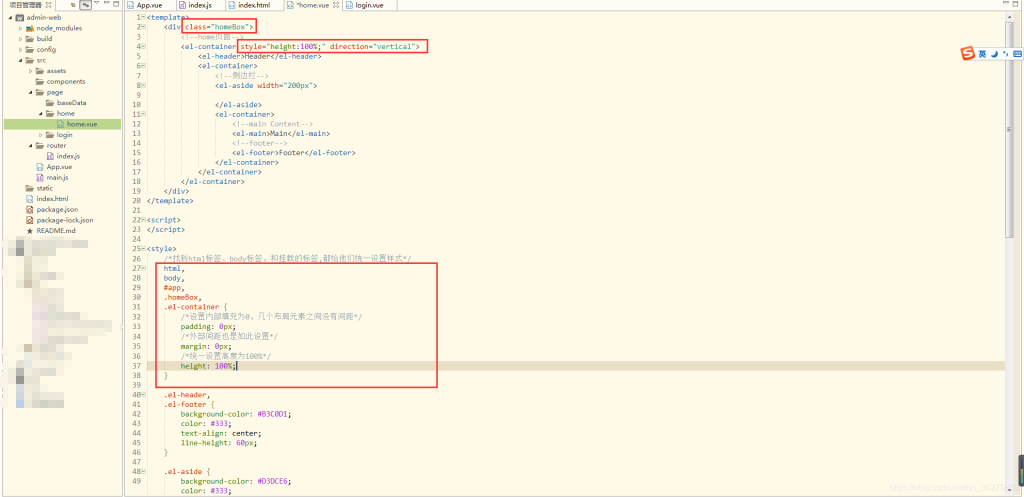 3、给el-container设置direction=”vertical”,因为包含main和footer