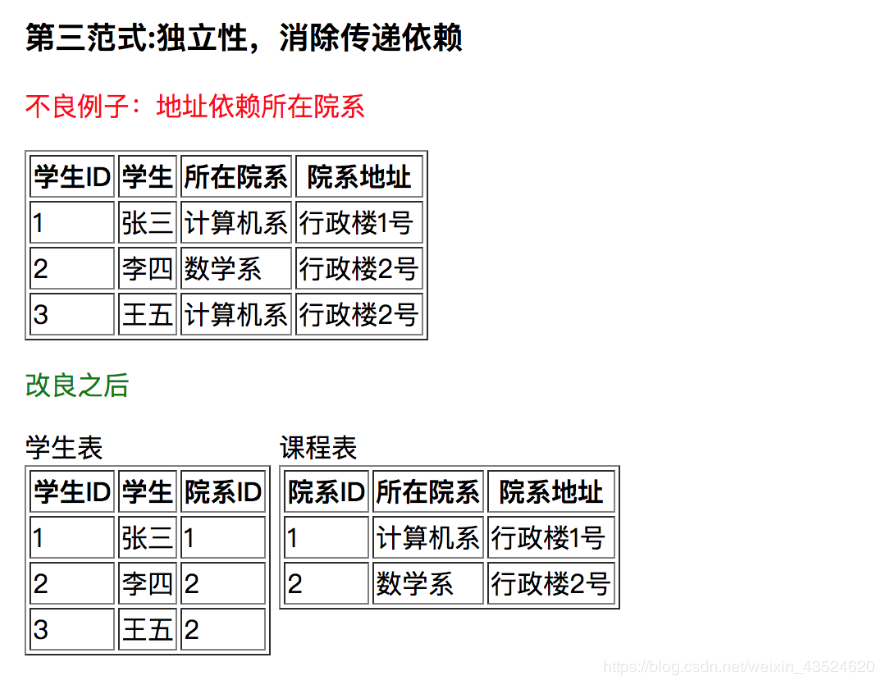 第三范式: 在第二范式的基础上更进一层,目标是确保每列都和主键列直接相关,而不是间接相关(另外非主键列必须直接依赖于主键,不能存在传递依赖).