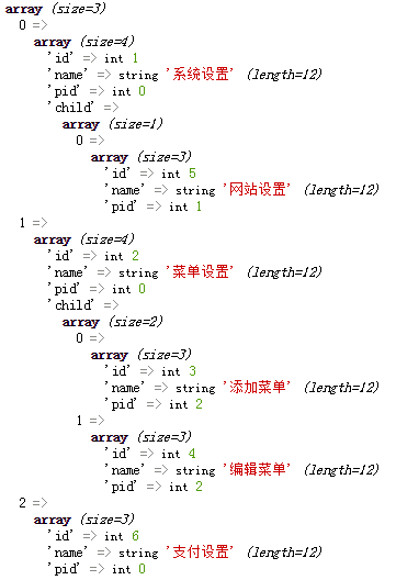 array('id' => 3, 'name' => '添加菜单', 'pid' => 2),