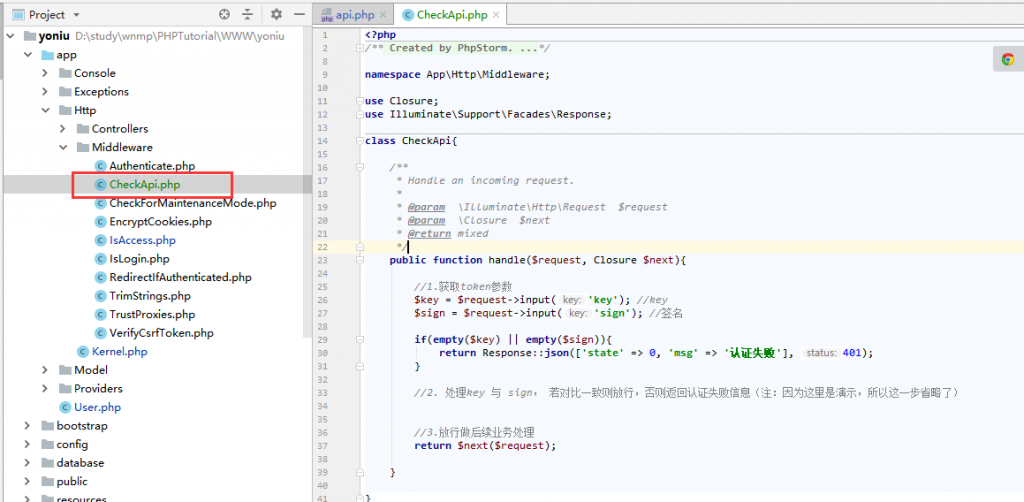 其实laravel实现api开发非常简单,有时需要认证处理。一般都是在中间件里完成认证,若认证通过则放行,否则返回认证失败信息