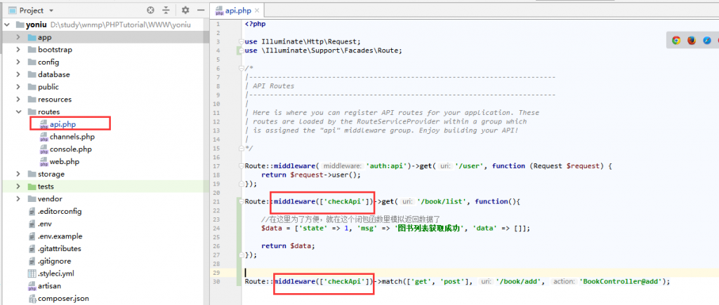 注意:访问接口时uri需要加上/api前缀,如在路由文件中定义了“/book/list”,那么接口地址 必须时 /api/book/list