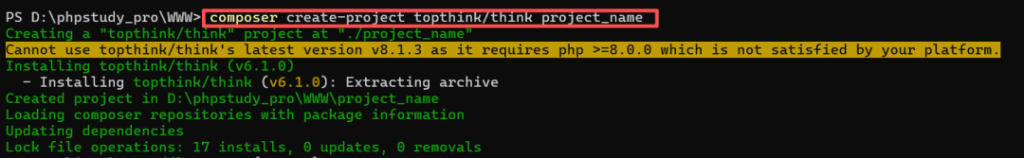 上图黄色背景文字提示,要安装thinphp最新版本8.x ,需要基于php版本8.0及以上。