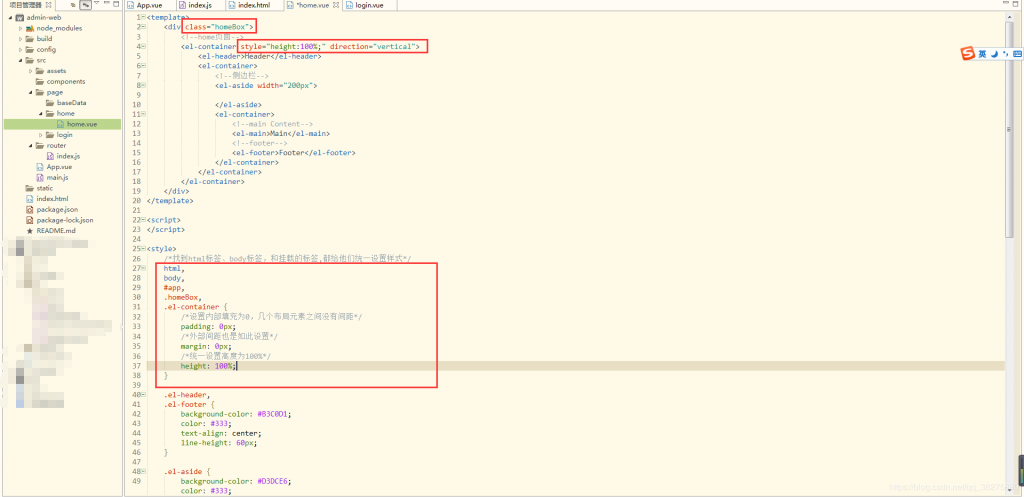 3、 给el-container设置direction=”vertical”,因为包含main和footer